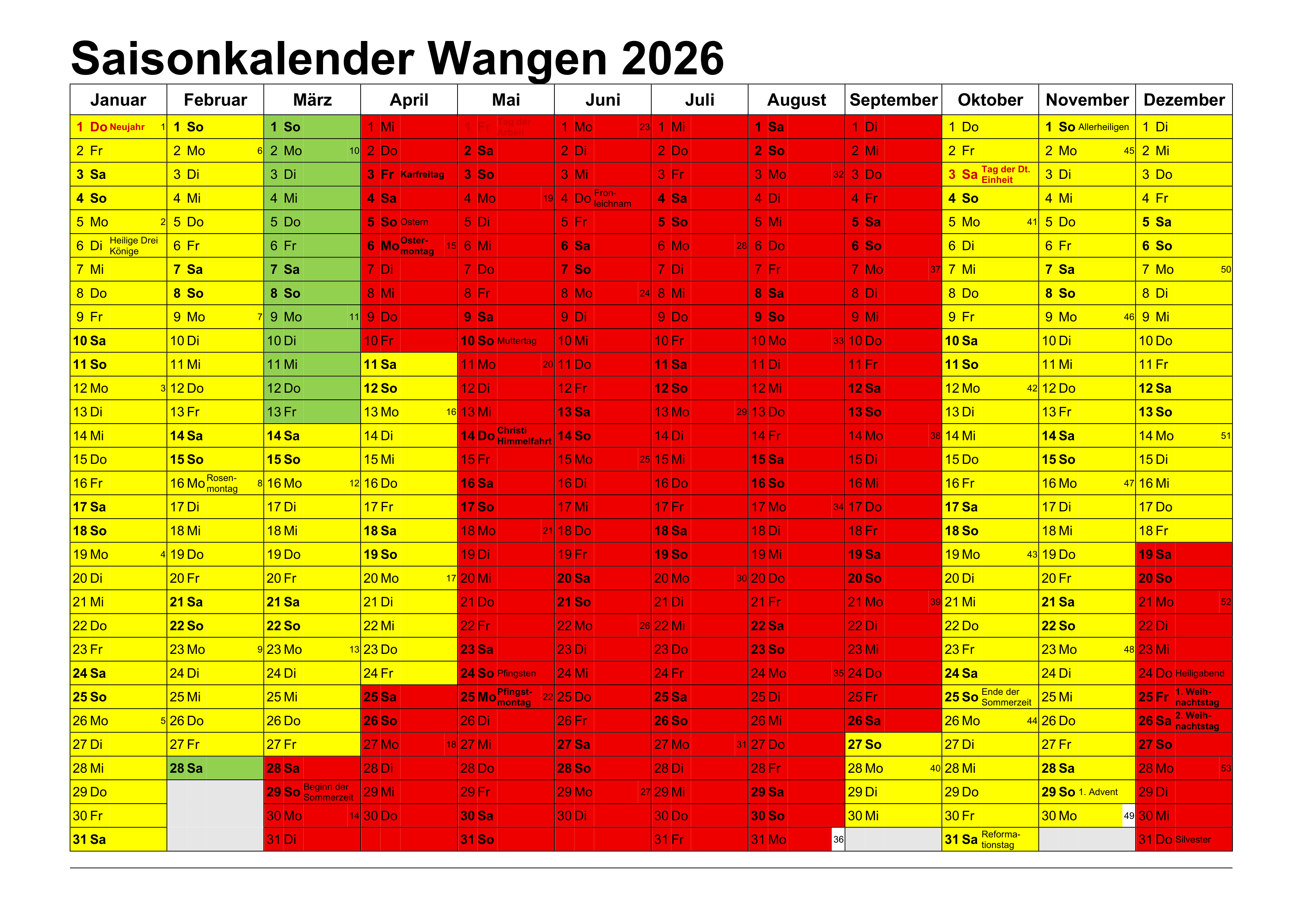 Schwerbehinderte mit Ausweis: 50% Ermäßigung, eingetragene Begleitperson „B“ keine Kurtaxe (Kopie des Ausweises notwendig). Die Zeiträume der verschiedenen Saisons können dem folgenden Kalender entnommen werden: Saisonkalender Wangen 2026